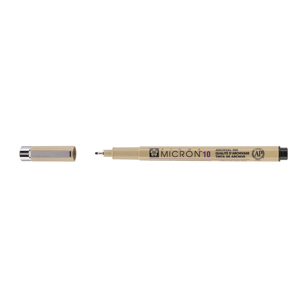 Micronien vesipohjainen pigmenttimuste kuivuu nopeasti, eikä muste vuoda ohuenkaan paperin läpi. Kynästä löytyy 10 eri kokoa: